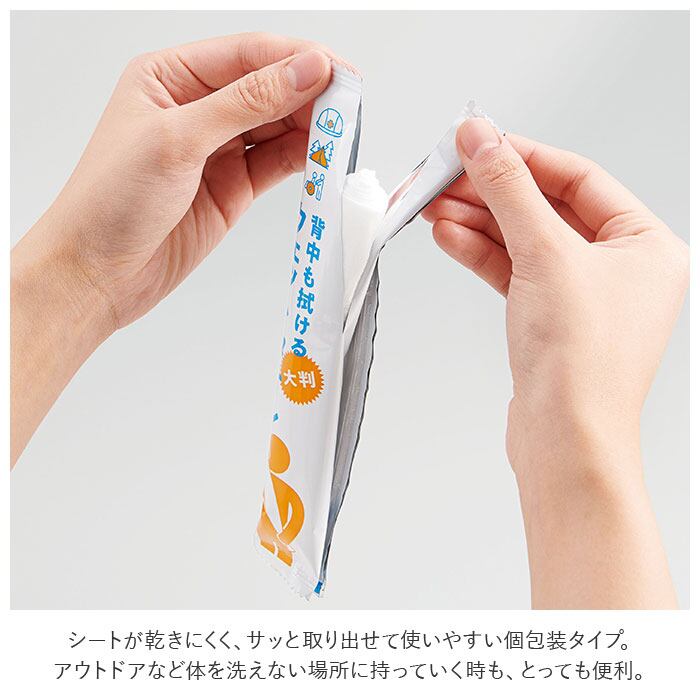 ・シートが乾きにくく、サッと取り出せて使いやすい個包装タイプ。アウトドアなど体を洗えない場所に持っていく時も、個包装だととっても便利。