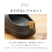 ・かかと部分に配置された、脱ぎ履きにも役立つキャメルのレザー調タグがアクセント。アンティークゴールドのリベットが、タグをかっこよく引き立てる!