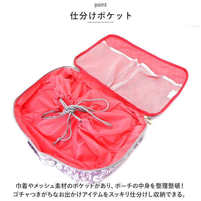 ・巾着やメッシュ素材のポケットがあり、ポーチの中身を整理整頓!ゴチャつきがちなお出かけアイテムをスッキリ仕分けし収納できる。