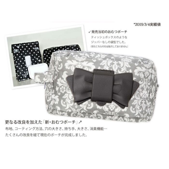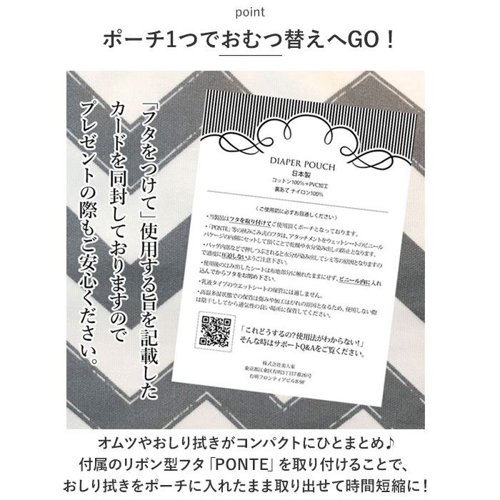 ・オムツやおしり拭きがコンパクトにひとまとめ♪付属のリボン型フタ「PONTE」を取り付けることで、おしり拭きをポーチに入れたまま取り出せて時間短縮に!
