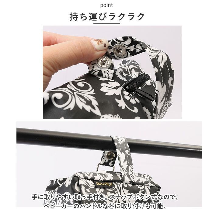 ・手に取りやすい取っ手付き。スナップボタン式なので、ベビーカーのハンドルなどに取り付けも可能。