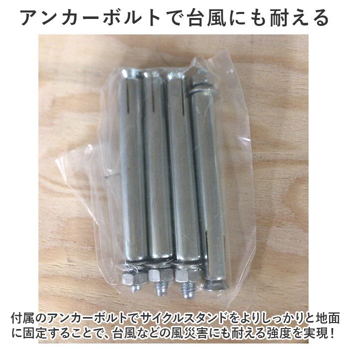 ・付属のアンカーボルトでサイクルスタンドをよりしっかりと地面に固定することで、台風などの風災害にも耐える強度を実現!