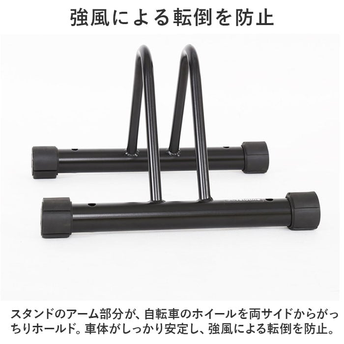 ・スタンドのアーム部分が、自転車のホイールを両サイドからがっちりホールド。車体がしっかり安定し、強風による転倒を防止。