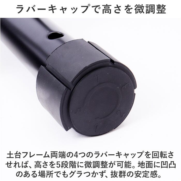 ・土台フレーム両端の4つのラバーキャップを回転させれば、高さを5段階に微調整が可能。地面に凹凸のある場所でもグラつかず、抜群の安定感。