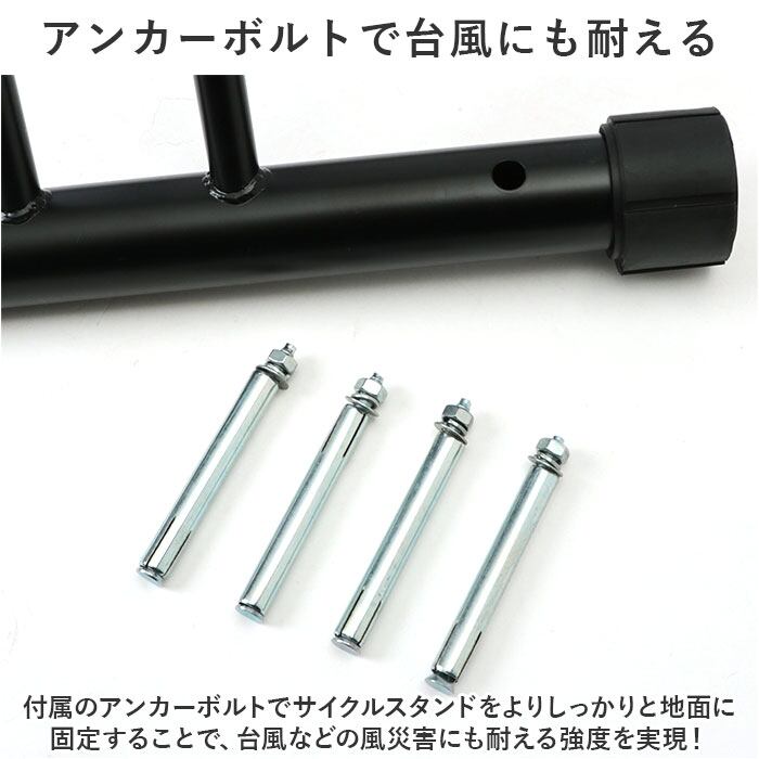 ・付属のアンカーボルトでサイクルスタンドをよりしっかりと地面に固定することで、台風などの風災害にも耐える強度を実現!