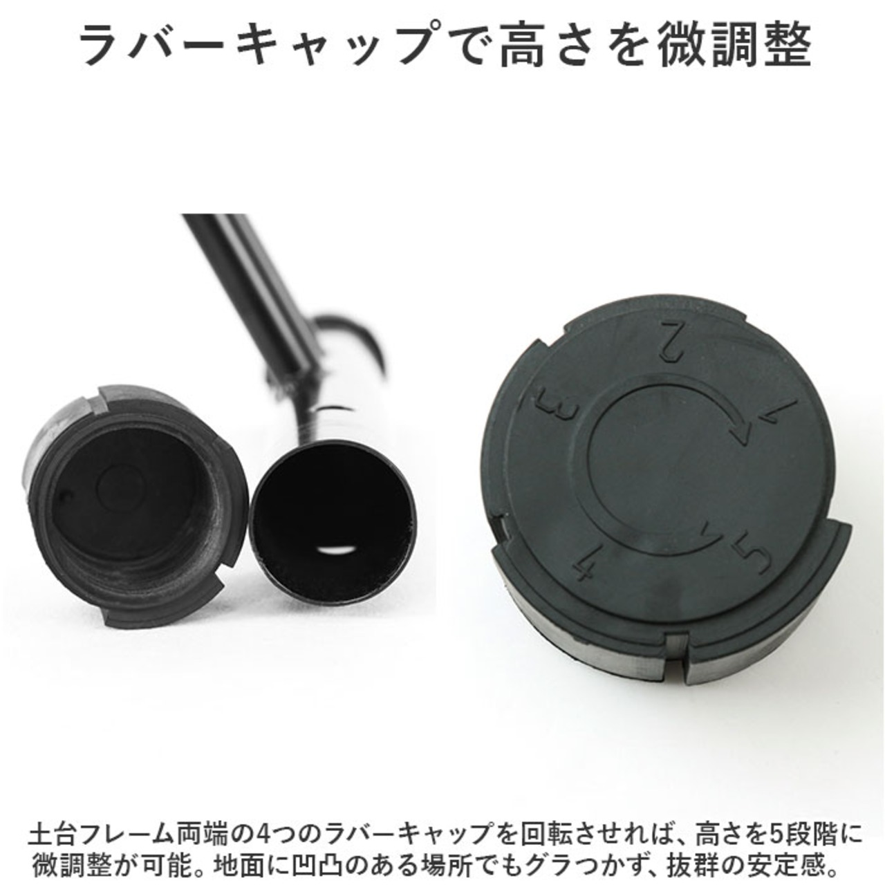 ・土台フレーム両端の4つのラバーキャップを回転させれば、高さを5段階に微調整が可能。地面に凹凸のある場所でもグラつかず、抜群の安定感。