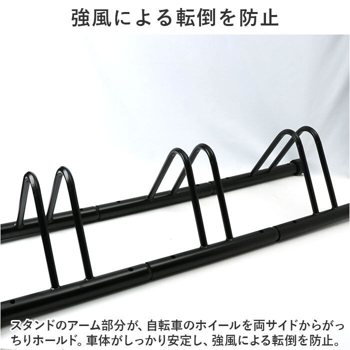 ・スタンドのアーム部分が、自転車のホイールを両サイドからがっちりホールド。車体がしっかり安定し、強風による転倒を防止。