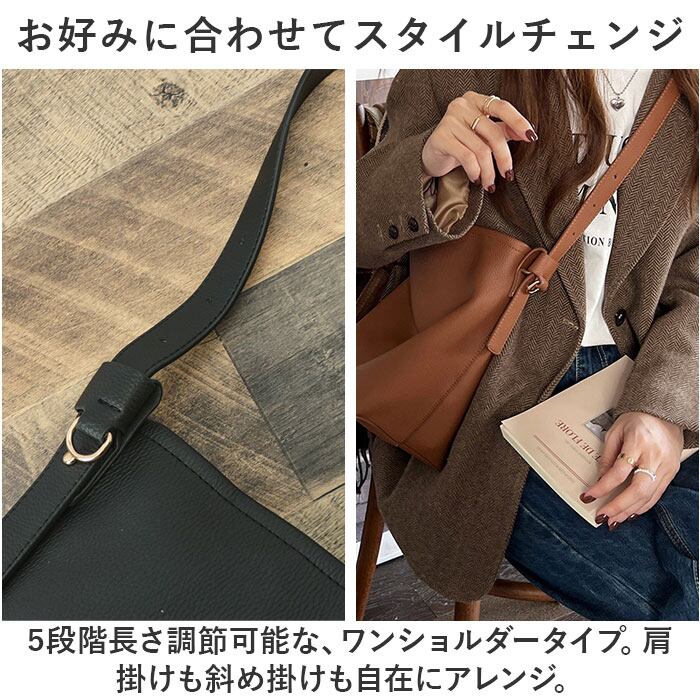 ・5段階長さ調節可能な、ワンショルダータイプ。肩掛けも斜め掛けも自在にアレンジ。
