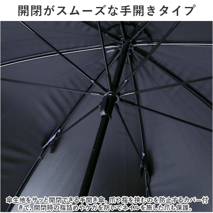 ・傘生地をサッと開閉できる手開き傘。爪や指を挟むのを防止するカバー付きで、開閉時の指詰めやケガを防いでネイルを施した爪も保護。
