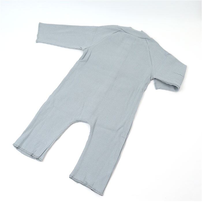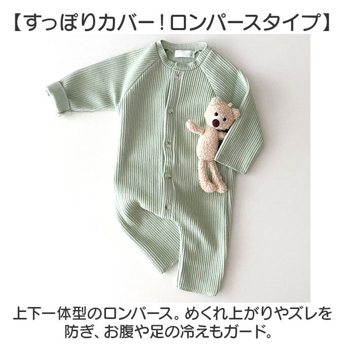 ・上下一体型のロンパース。めくれ上がりやズレを防ぎ、お腹や足の冷えもガード。