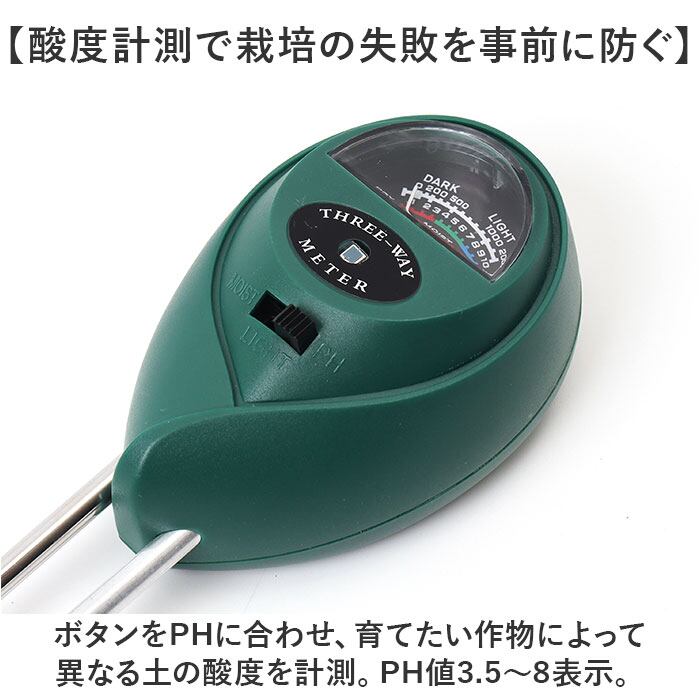 ・ボタンをPHに合わせ、育てたい作物によって異なる土の酸度を計測。PH値3.5〜8表示。