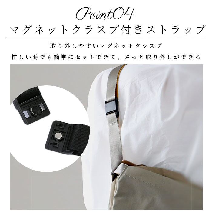 ・ストラップはマグネットクラスプ付きで取り外しがしやすく、忙しい時でも簡単にセットできて、さっと取り外しができる。