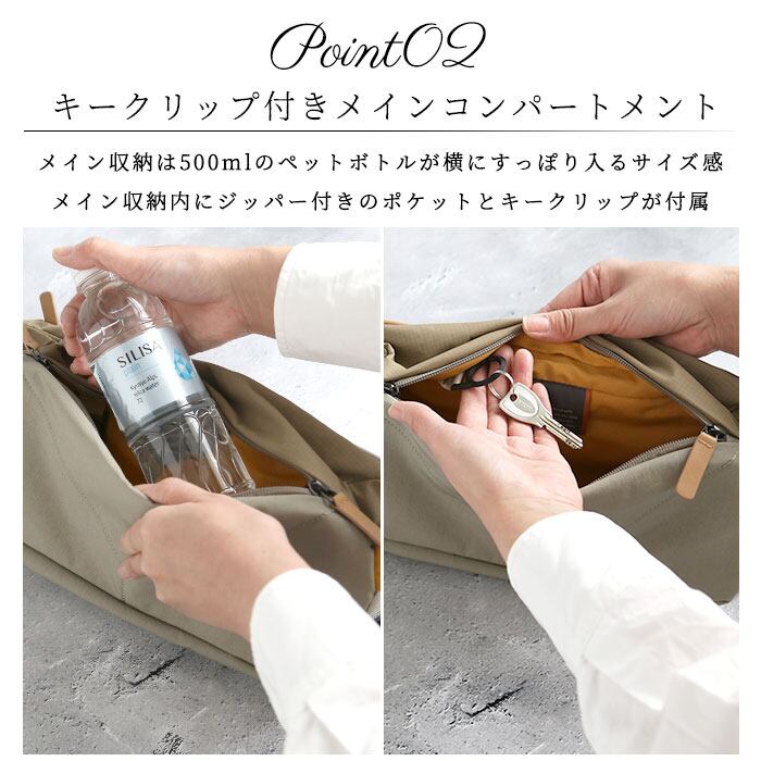 ・メイン収納は500mlのペットボトルが横にすっぽり入るサイズ感。メイン収納内にジッパー付きのポケットとキークリップが付属。
