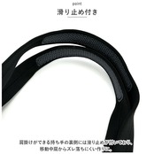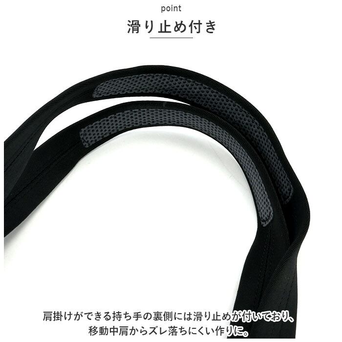 ・肩掛けができる持ち手の裏側には滑り止めが付いており、移動中肩からズレ落ちにくい作りに。