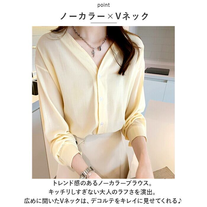 ・トレンド感のあるノーカラーブラウス。キッチリしすぎない大人のラフさを演出。広めに開いたVネックは、デコルテをキレイに見せてくれる♪