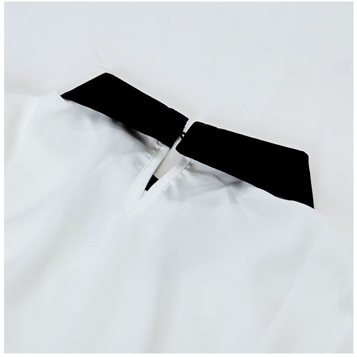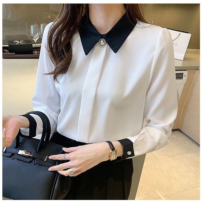 ・モノトーンな配色使いで、シンプルに仕上げたブラウス。襟付きできちんと感をプラス。