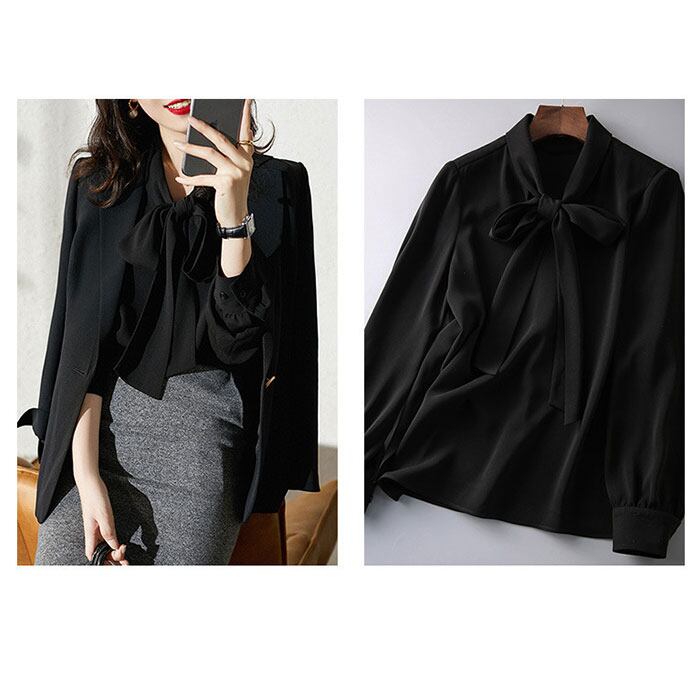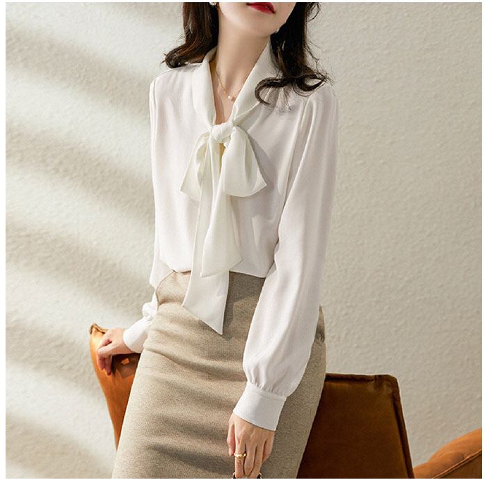 ・上品な印象を与える長袖のリボンタイブラウスが登場。