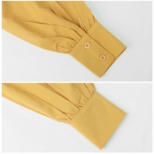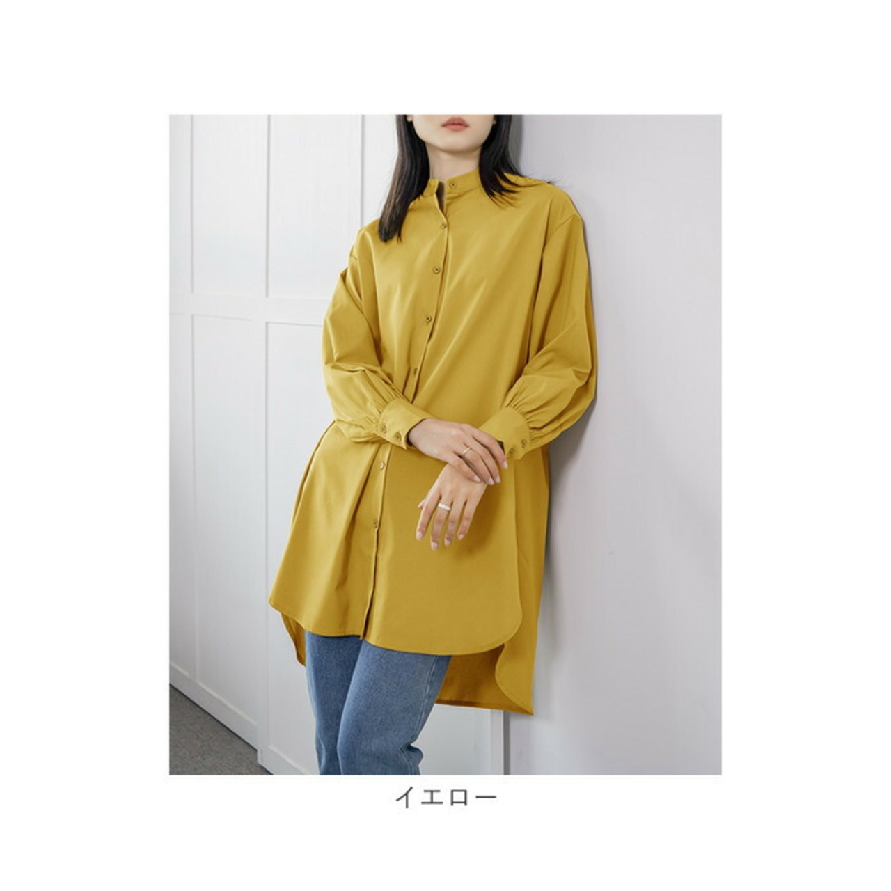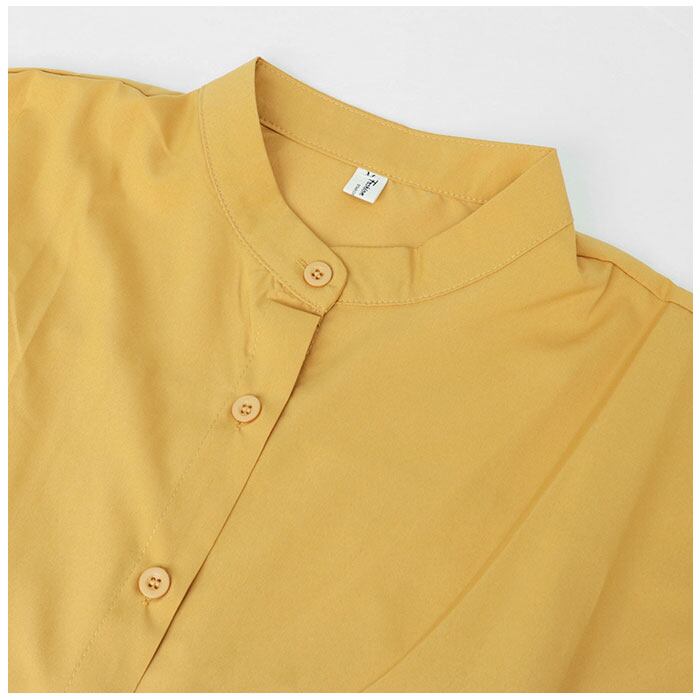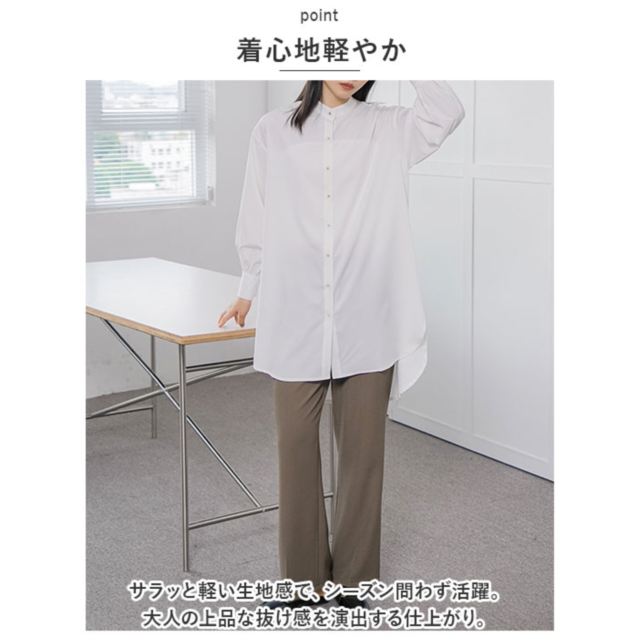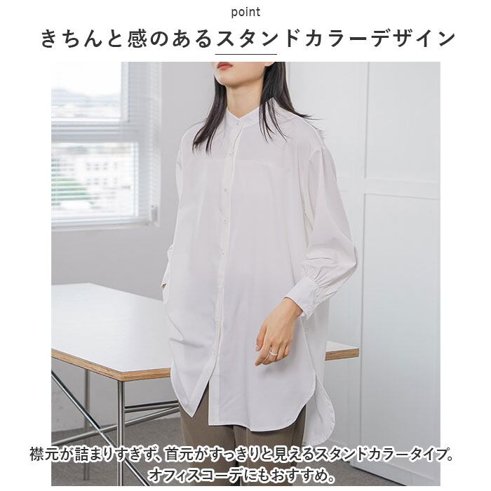 ・襟元が詰まりすぎず、首元がすっきりと見えるスタンドカラータイプ。オフィスコーデにもおすすめ。