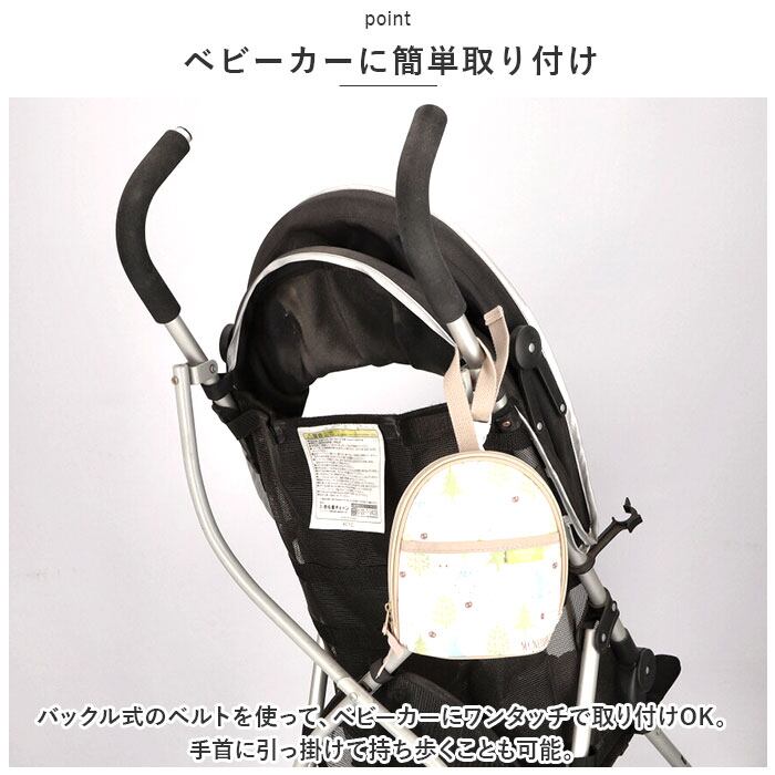 ・バックル式のベルトを使って、ベビーカーにワンタッチで取り付けOK。手首に引っ掛けて持ち歩くことも可能。