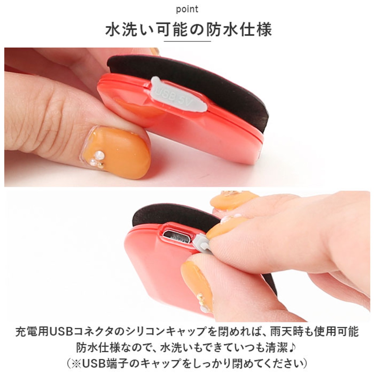 ・充電用USBコネクタのシリコンキャップを閉めれば、雨天時も使用可能。防水仕様なので、水洗いもできていつも清潔♪(※USB端子のキャップをしっかり閉めてください)