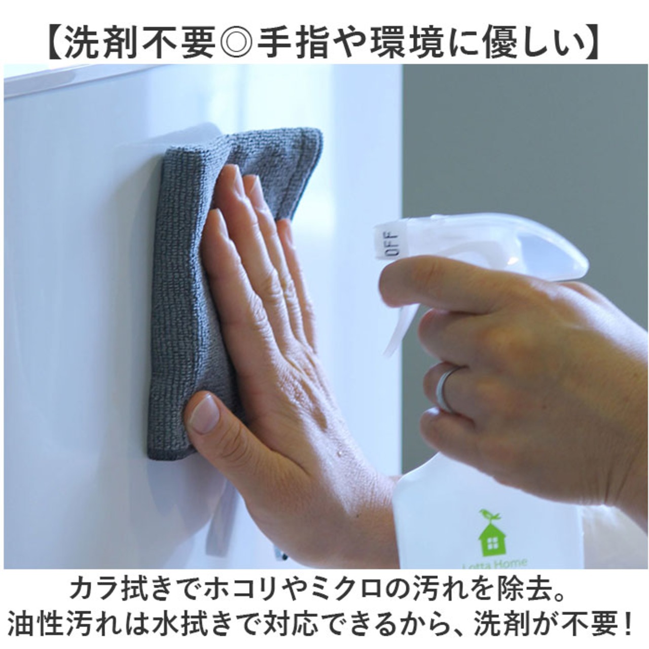 ・カラ拭きでホコリやミクロの汚れを除去。油性汚れは水拭きで対応できるから、洗剤が不要!