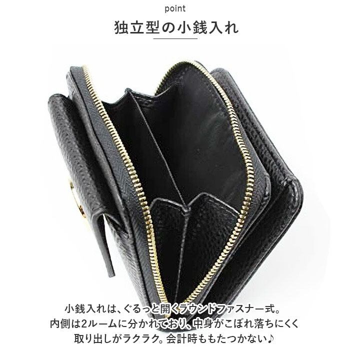 ・小銭入れは、ぐるっと開くラウンドファスナー式。内側は2ルームに分かれており、中身がこぼれ落ちにくく取り出しがラクラク。会計時ももたつかない♪