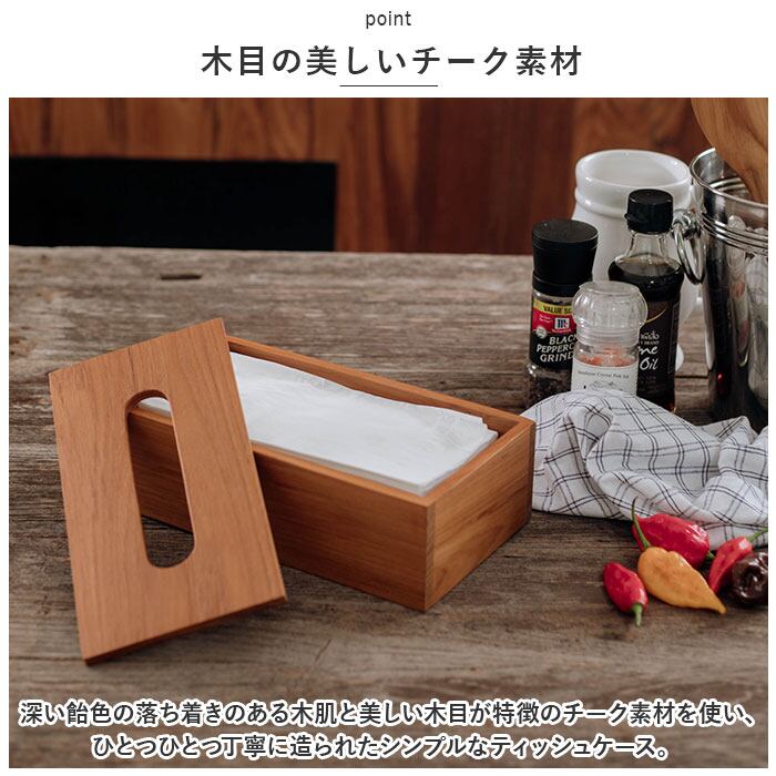 ・深い飴色の落ち着きのある木肌と美しい木目が特徴のチーク素材を使い、ひとつひとつ丁寧に造られたシンプルなティッシュケース。