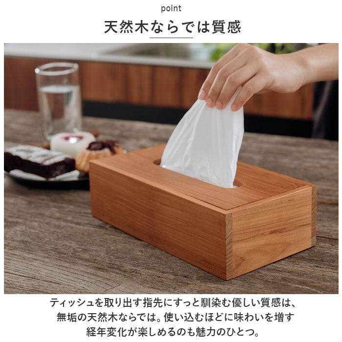 ・ティッシュを取り出す指先にすっと馴染む優しい質感は、無垢の天然木ならでは。使い込むほどに味わいを増す経年変化が楽しめるのも魅力のひとつ。