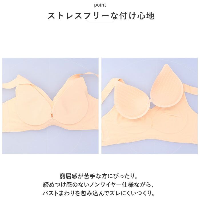 ・窮屈感が苦手な方にぴったり。締めつけ感のないノンワイヤー仕様ながら、バストまわりを包み込んでズレにくいつくり。