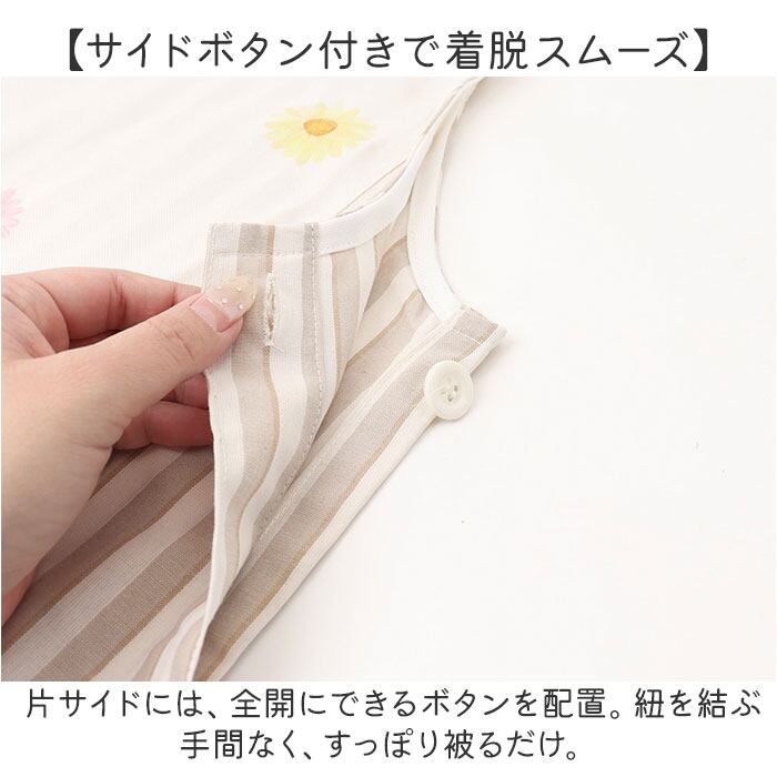 ・片サイドには、全開にできるボタンを配置。紐を結ぶ手間なく、すっぽり被るだけ。