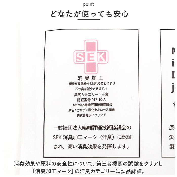 ・消臭効果や原料の安全性について、第三者機関の試験をクリアし「消臭加工マーク」の汗臭カテゴリーに製品認証。