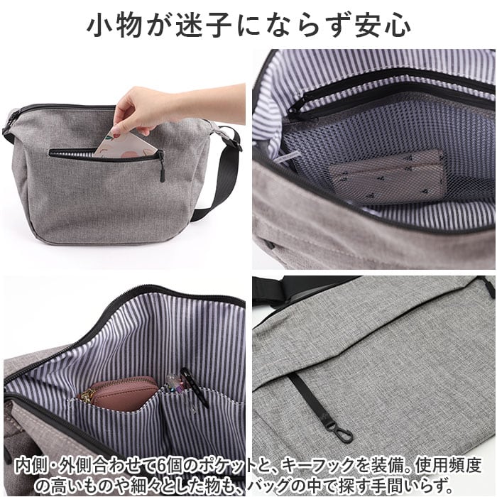 ・内側・外側合わせて6個のポケットと、キーフックを装備。使用頻度の高いものや細々とした物も、バッグの中で探す手間いらず。
