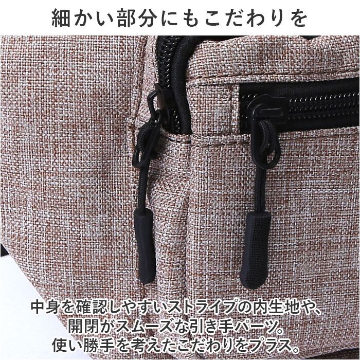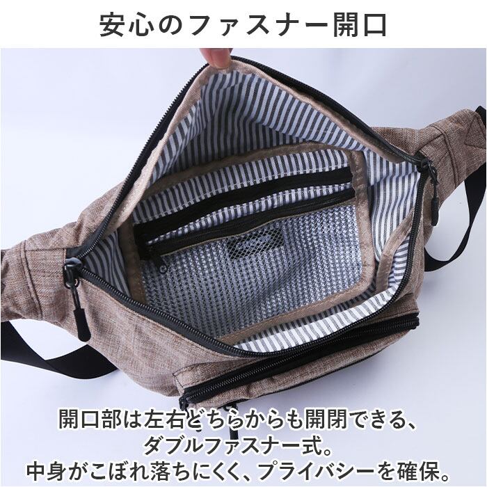 ・開口部は左右どちらからも開閉できる、ダブルファスナー式。中身がこぼれ落ちにくく、プライバシーを確保。