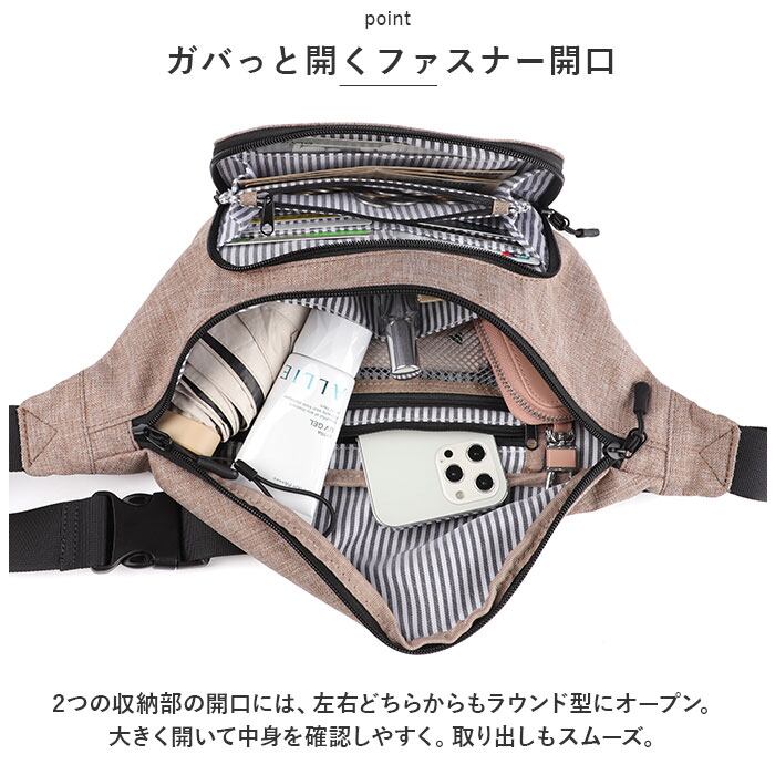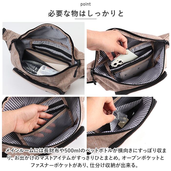・メインルームには長財布や500mlのペットボトルが横向きにすっぽり収まり、お出かけのマストアイテムがすっきりひとまとめ。オープンポケットとファスナーポケットがあり、仕分け収納が出来る。
