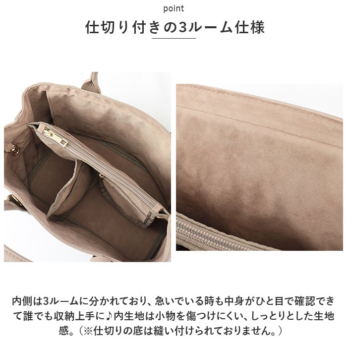 ・内側は3ルームに分かれており、急いでいる時も中身がひと目で確認できて誰でも収納上手に♪内生地は小物を傷つけにくい、しっとりとした生地感。(※仕切りの底は縫い付けられておりません。)