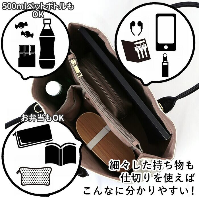 ・内側は3ルームに分かれており、急いでいる時も中身がひと目で確認できて誰でも収納上手に♪内生地は小物を傷つけにくい、しっとりとした生地感。(※仕切りの底は縫い付けられておりません。)