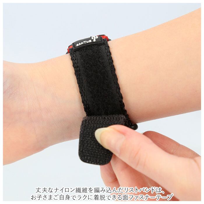 ・丈夫なナイロン繊維を編み込んだリストバンドは、お子さまご自身でラクに着脱できる面ファスナーテープ式。