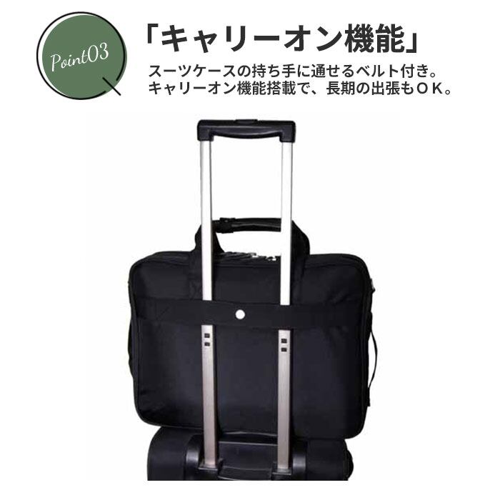 ・スーツケースの持ち手に通せるベルト付き。キャリーオン機能搭載で、長期の出張もOK。