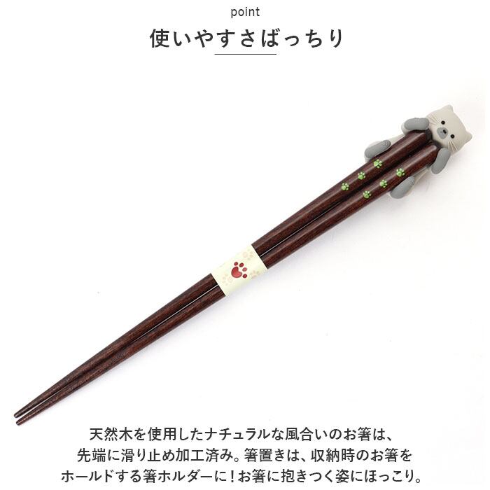 ・天然木を使用したナチュラルな風合いのお箸は、先端に滑り止め加工済み。箸置きは、収納時のお箸をホールドする箸ホルダーに!お箸に抱きつく姿にほっこり。