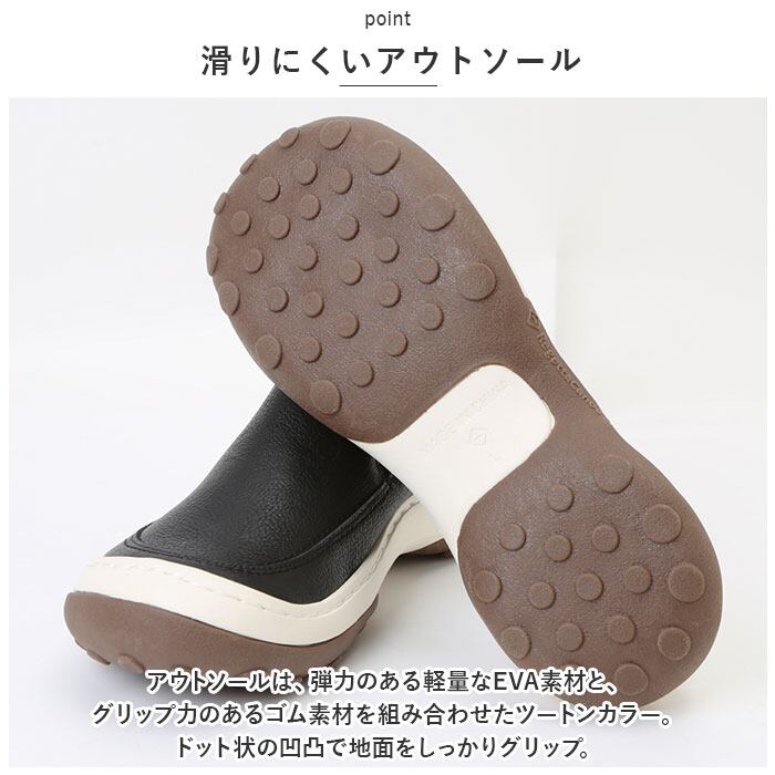 ・アウトソールは、弾力のある軽量なEVA素材と、グリップ力のあるゴム素材を組み合わせたツートンカラー。ドット状の凹凸で地面をしっかりグリップ。