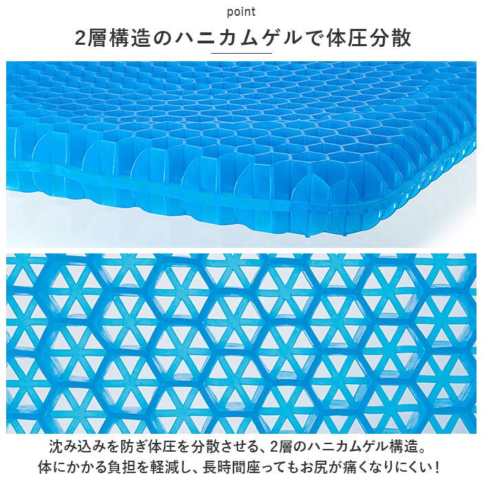 ・沈み込みを防ぎ体圧を分散させる、2層のハニカムゲル構造。体にかかる負担を軽減し、長時間座ってもお尻が痛くなりにくい!