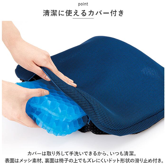 ・カバーは取り外して手洗いできるから、いつも清潔。表面はメッシ素材、裏面は椅子の上でもズレにくいドット形状の滑り止め付き。