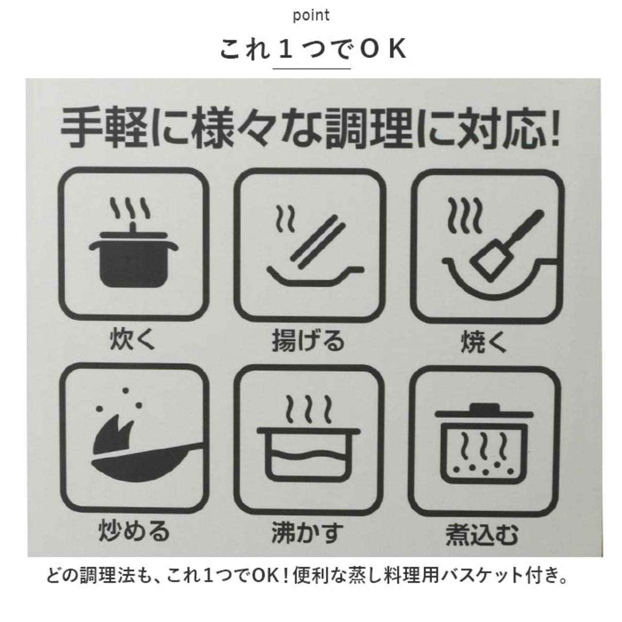 ・焼く、煮る、炒める、揚げる、蒸す…どの調理法も、これ1つでOK!便利な蒸し料理用バスケット付き。