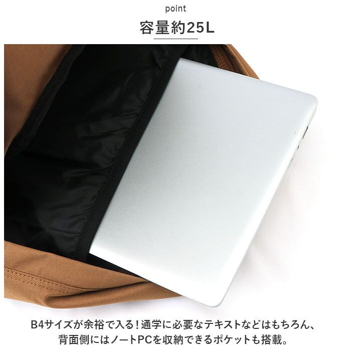 ・B4サイズが余裕で入る!通学に必要なテキストなどはもちろん、背面側にはノートPCを収納できるポケットも搭載。