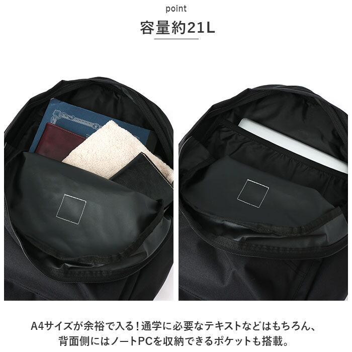 ・A4サイズが余裕で入る!通学に必要なテキストなどはもちろん、背面側にはノートPCを収納できるポケットも搭載。