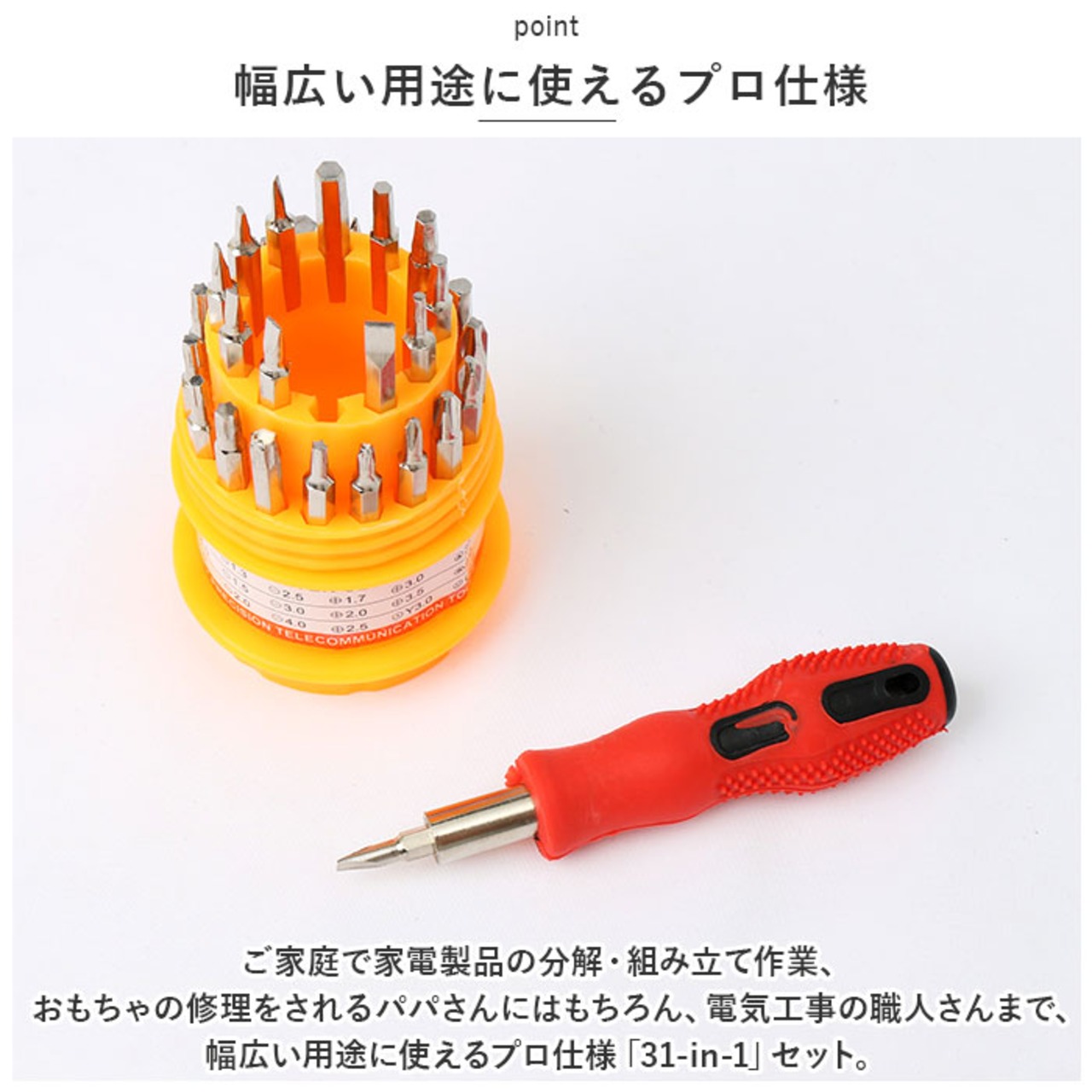 ・ご家庭で家電製品の分解・組み立て作業、おもちゃの修理をされるパパさんにはもちろん、電気工事の職人さんまで、幅広い用途に使えるプロ仕様「31-in-1」セット。
