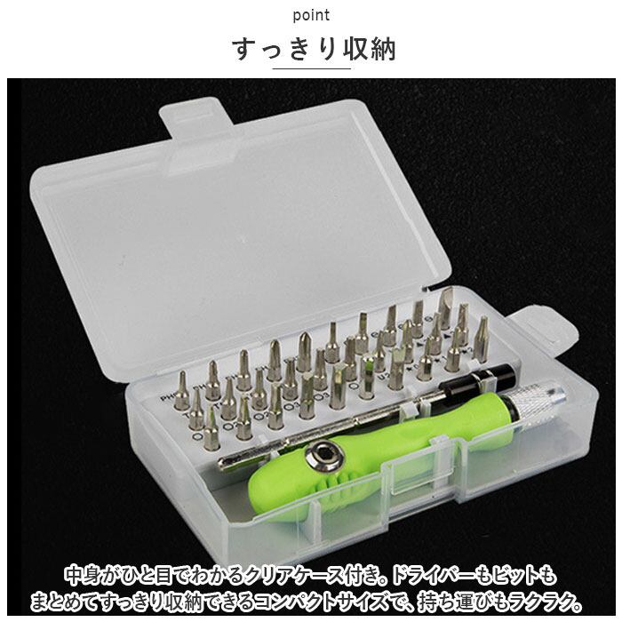 ・中身がひと目でわかるクリアケース付き。ドライバーもビットもまとめてすっきり収納できるコンパクトサイズで、持ち運びもラクラク。