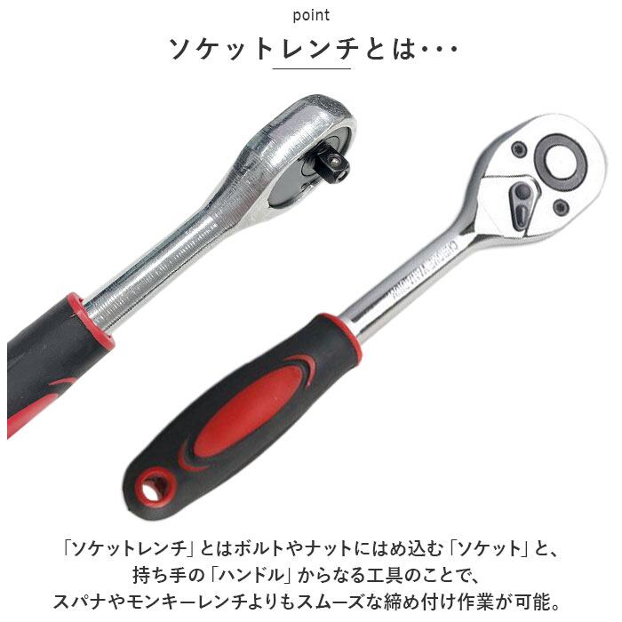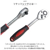 ・「ソケットレンチ」とはボルトやナットにはめ込む「ソケット」と、持ち手の「ハンドル」からなる工具のことで、スパナやモンキーレンチよりもスムーズな締め付け作業が可能。
