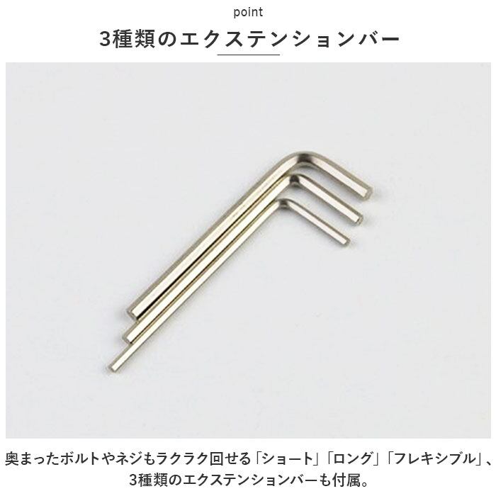 ・奥まったボルトやネジもラクラク回せる「ショート」「ロング」「フレキシブル」、3種類のエクステンションバーも付属。