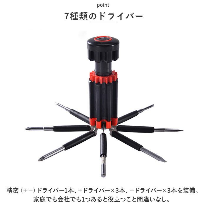 ・精密(+-)ドライバー1本、+ドライバー×3本、-ドライバー×3本を装備。家庭でも会社でも1つあると役立つこと間違いなし。